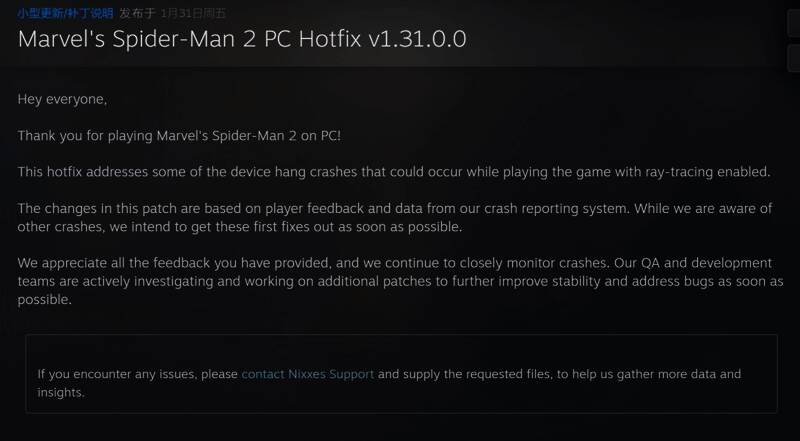 具体来说,首个补丁修复了开启光追就引发崩溃的问题。Nixxes还表示他们已经意识到其他引起崩溃的问题,正在通过其他更新修复。