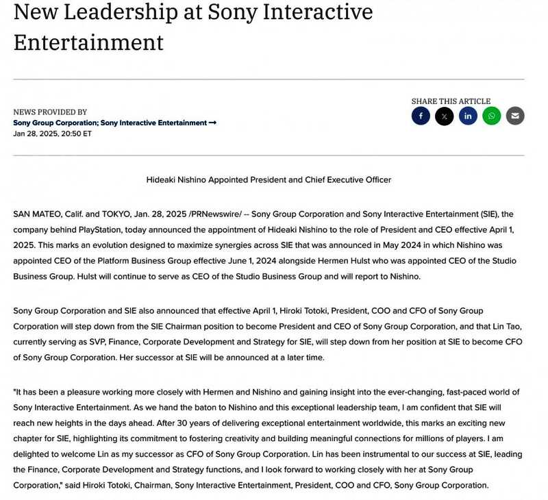 今天,索尼发布声明对PlayStation领导层再次进行了变动。西野英明将从2025年4月1日起全面接任索尼互动娱乐(SIE)总裁兼CEO一职。