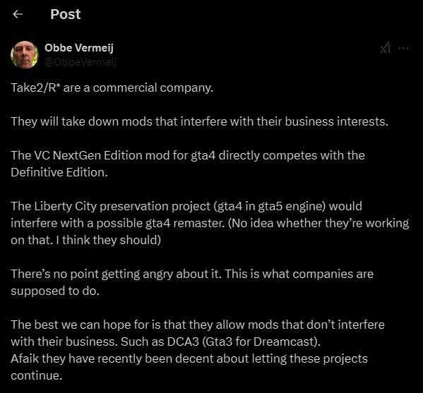 近日前R星资深开发者Obbe Vermeij发表了自己的看法,他认为Take-Two和Rockstar作为商业公司,自然会对可能妨碍其商业利益的MOD出手,这是无可厚非的因此玩家也没必要为此而恼火。不过Vermeij还补充说:“我们所能期望的最好结果是他们允许不妨碍他们业务的MOD。”并透露官方其实在“最近一直很体面地允许这些项目继续进行”。