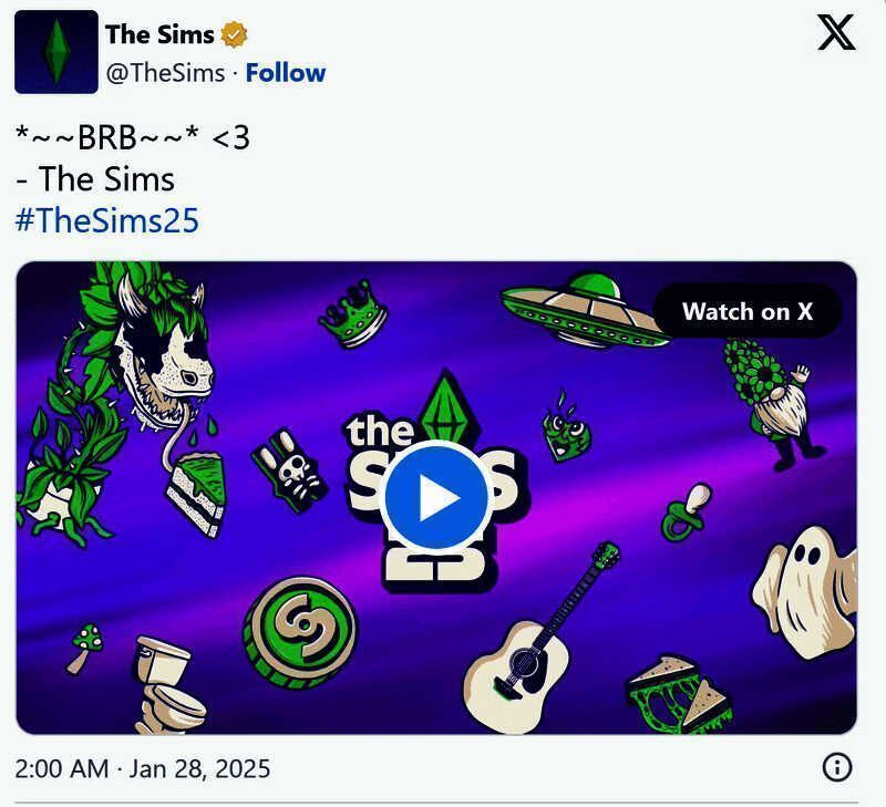 周一,《模拟人生》官推还发布了一条消息“BRB”,并附上一段动画,展示了《模拟人生2》的操作菜单,然后是《模拟人生》包装盒上的彩色方形背景。