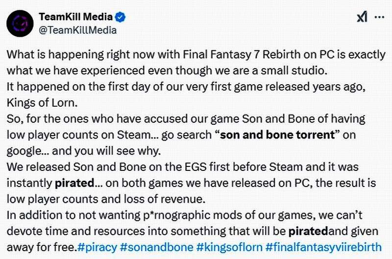 近日TeamKill Media在推特上谈及《最终幻想7:重生》PC版遭盗版破解的情况。“《最终幻想7:重生》PC版被盗版的情况与我们的经历如出一辙,尽管我们只是一个小工作室,但多年前我们的第一款游戏《洛恩之王》发售首日就被盗版。”