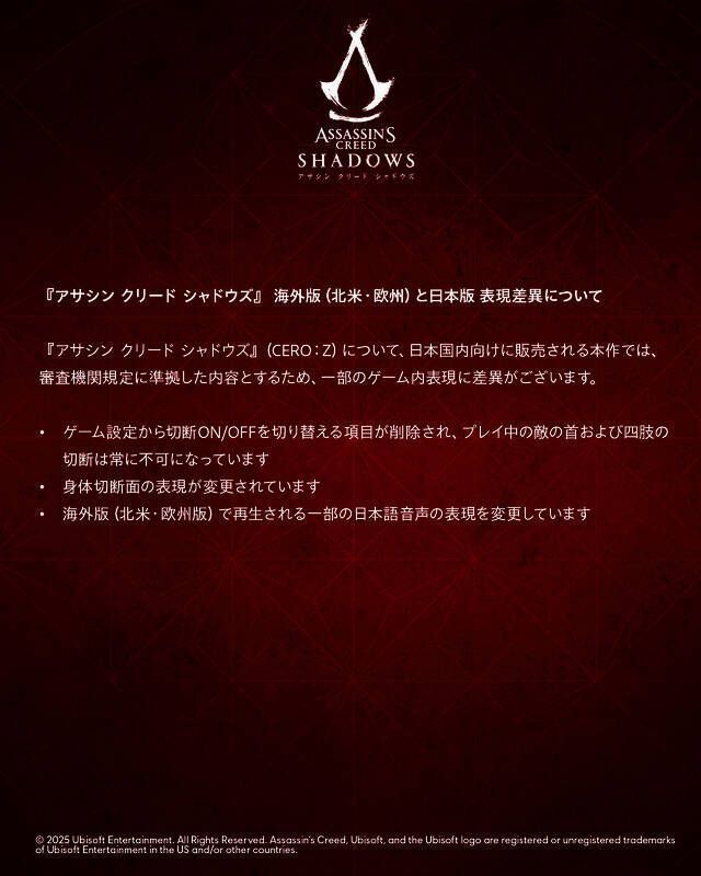 关于《刺客信条:影》(CERO:Z),由于符合日本国内的审查机构规定,因此在部分游戏内的表现上与海外版存在差异。