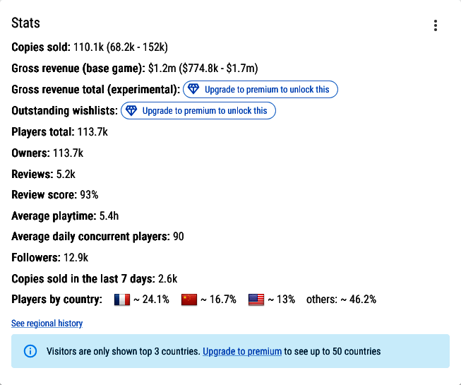当然,在不同地区游戏的售价也不相同。这款文字冒险游戏在国区的售价仅 42 元,并且支持简体中文。在评测中也有许多都是来自国内玩家。因此如果只是按照国区价格计算,收入还没有破百万美元。这还要考虑有更便宜的低价区以及促销期间的销量。根据 Gamalytic,玩家中有 16.7% 都是来自中国。