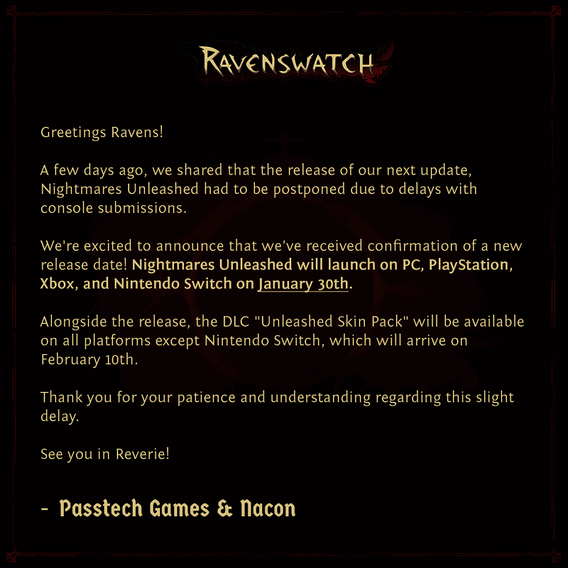 近日,roguelike 动作游戏《鸦卫奇旅》官方宣布,此前被推迟的“梦魇释放”(Nightmares Unleashed)更新将于1月20日正式上线,登陆PlayStation、Xbox、Switch和PC。