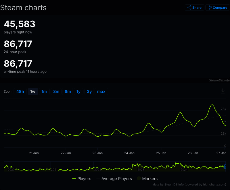 根据 SteamDB 显示,由于《荒野大镖客2》在 Steam 上进行的促销,游戏的同时在线玩家人数近日屡破新高,并于昨日(1 月 26 日)达到了 86,717 人。