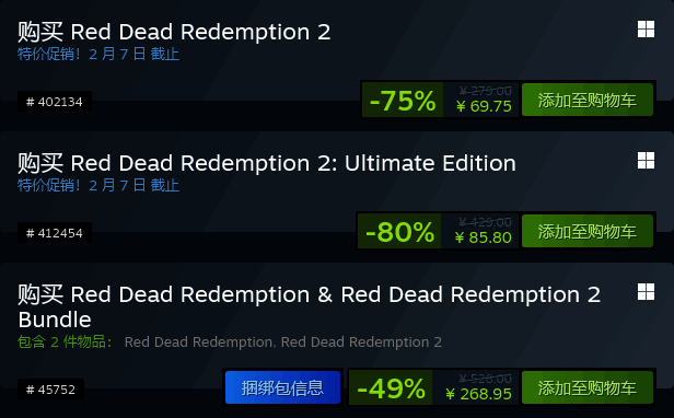 目前,R 星旗下游戏正在 Steam 进行低至 2 折的特价促销活动,《荒野大镖客2》游戏本体折扣为 -75%,终极版折扣为 -80%,折后价分别为 69.75 元和 85.80 元。折扣持续至 2 月 7 日。