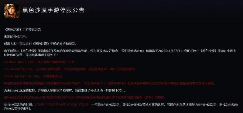 早先腾讯《黑色沙漠》手游官方发布公告称,2025年1月27日11点正式停止《黑色沙漠》手游在中国大陆地区的运营。停服原因是腾讯与《黑色沙漠》手游游戏开发商的代理协议即将到期。