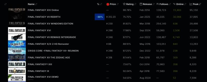 《最终幻想7》重制三部曲第二部《最终幻想7:重生》现已正式登陆PC,其中Steam版首发同时在线玩家数量峰值达到了37895,超越了前作《最终幻想7:重制版》的数据13803,成为了Steam上《最终幻想》系列玩家同时在线数量峰值最高的游戏(单机游戏,《最终幻想14》除外)。
