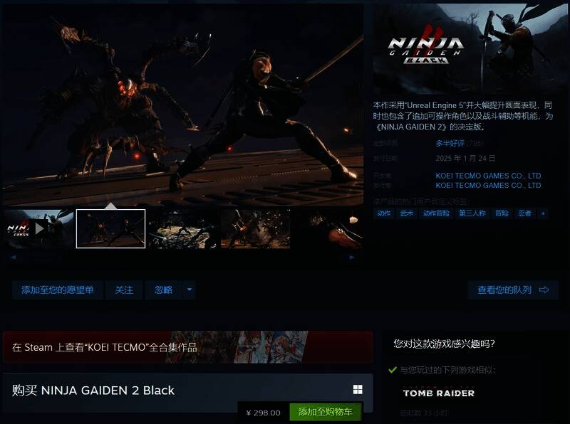 之前在Xbox直面会上,忍者龙剑传2复刻版《忍者龙剑传2 黑之章》正式公布。随后该作上架Steam并发售,售价298元,游戏总评为“多半好评”。