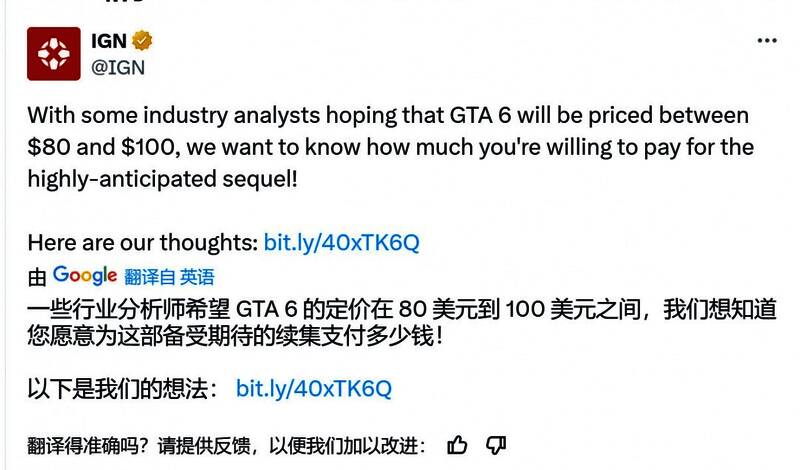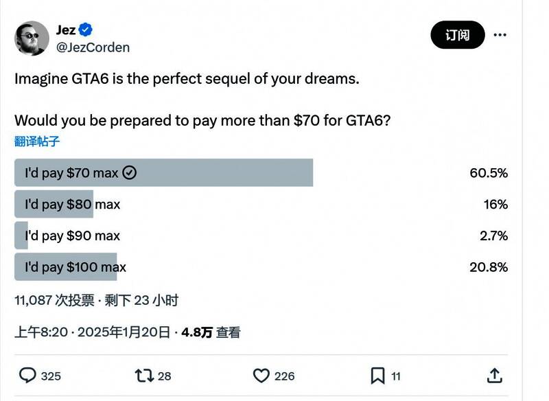 对于这种分析,业内记者Jez Corden在社交媒体上发布了一个调查。他说:“假如GTA6是你梦想中的完美续作,你会支持它超过70美元的定价吗?”随后给出了四个选择,分别是最高70美元,80美元,90美元和100美元。