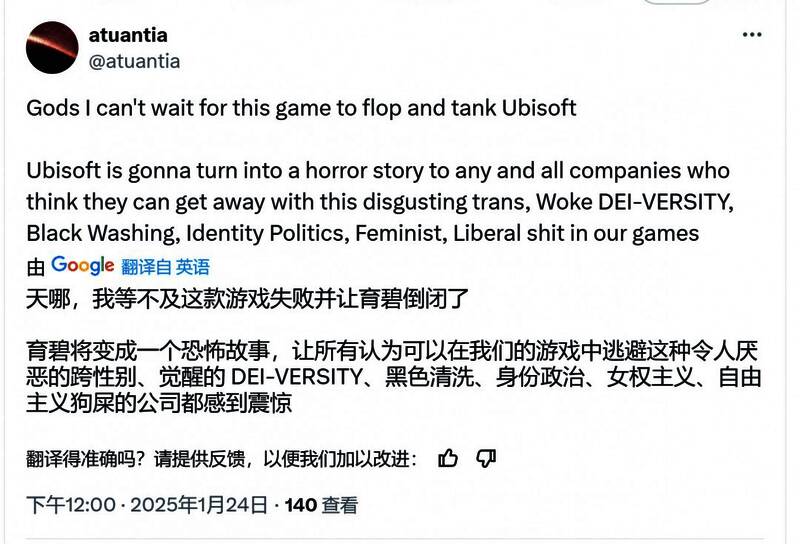 玩家:天呀,这个游戏赶紧扑街,让育碧倒闭吧。育碧快要把自己活生生地变成一个恐怖故事了,任何宣传令人恶心的变性人,woke多元,黑洗、身份政治、女权、进步主义等臭狗屎的公司,你们一个都休想逃脱这一厄运。