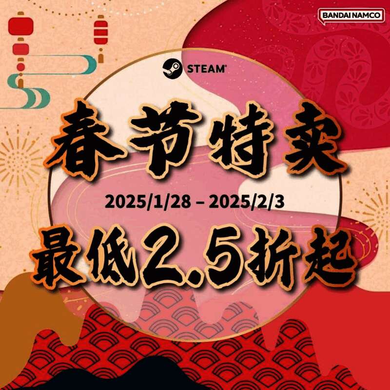 【2025年01月24日】万代南梦宫娱乐于今日宣布,STEAM的春节特卖活动将于2025年1月28日(二)~2025年2月3日(一)间展开,指定游戏于限定期间购买可享最低2.5折起优惠。