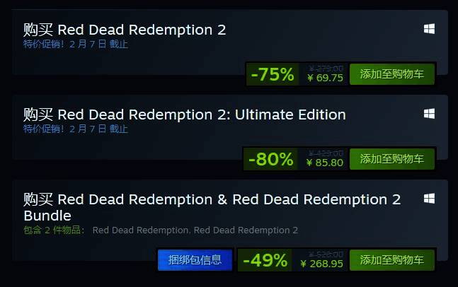 1月24日,R星《荒野大镖客2》Steam国区售价迎来新史低,标准版-75%折后价69.75元,终极版-80%折后价85.8元,《荒野大镖客2》+《荒野大镖客》捆绑包-50%折后价268.95元,优惠一直持续到2月7日。