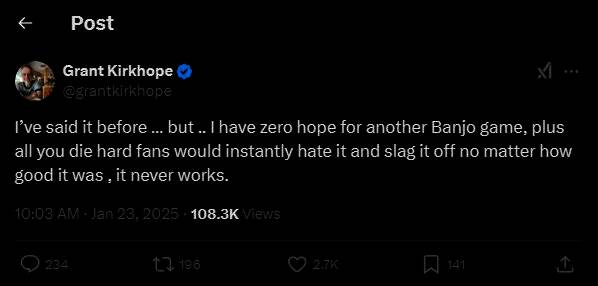 近日Grant Kirkhope在推特上发文表示,他再次强调自己:“对另一款《班卓熊大冒险》游戏不抱任何希望,再加上你们这些铁杆粉丝都会立刻讨厌它、批评它,不管它有多好,它都行不通。”