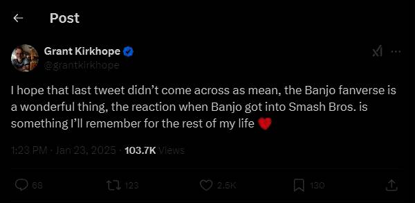 此外Kirkhope可能觉得自己之前的话有些不中听,因此他再度发文补充道:“我希望最后一条推文没有让人觉得刻薄,《班卓熊大冒险》粉丝世界是一件美妙的事情,当班卓熊加入《任天堂明星大乱斗》时的反应将是我一生难忘的事情。”