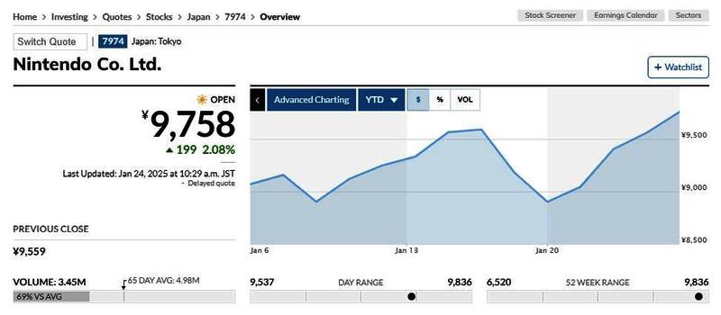 根据据MarketWatch等多家股票交易机构报道称,1月23日,任天堂股价创下9775日元的历史新高,收盘价9559日元,较前一交易日上涨1.65%。在1月16日Switch 2首个预告片发布之后,任天堂股价曾达到新高,随后几天略有下跌,然而,在分析师预测Switch 2首年销量将超过1600万台的帮助下,投资者迅速将兴趣转移到任天堂,推动股价创下新高。