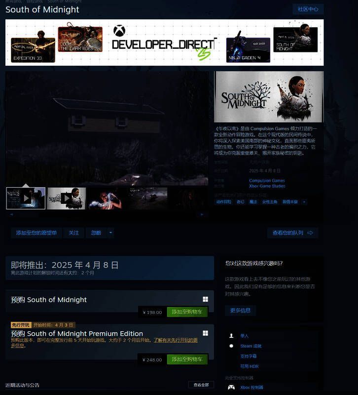 《午夜以南》Steam国区标准版198元,豪华版248元,自带简体中文,购买豪华版的玩家可提前5天解锁游戏。