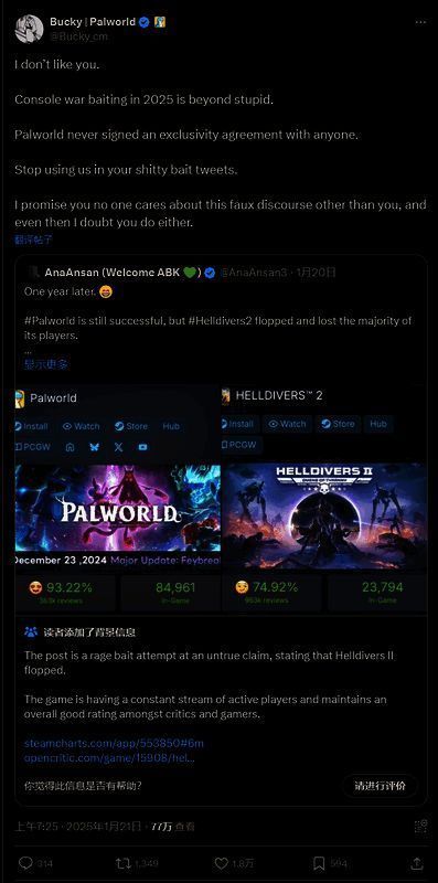 虽然有许多原因《绝地潜兵2》可能不如《幻兽帕鲁》玩家人数多,甚至连玩家最多的时候也不及更具话题性的《帕鲁》,但是这个账户显然试图将话题导向主机平台之间的竞争。这位用户称“《幻兽帕鲁》成功巅峰是在 Xbox 主机独占期间”,并问道:“为什么你认为 PlayStation 在制作多人游戏方面失败了?”