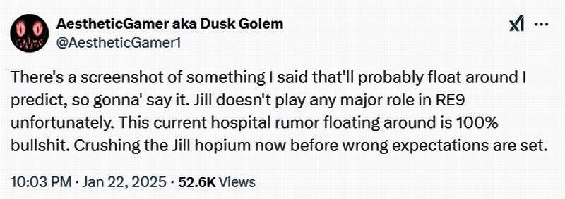 近日Dusk Golem发推文评论了《生化危机9》最近的传言。他表示吉尔不会在游戏中扮演重要角色,目前网上流传的“医院”剧情完全是虚假的,关于这款游戏的绝大多数传言也是假的。