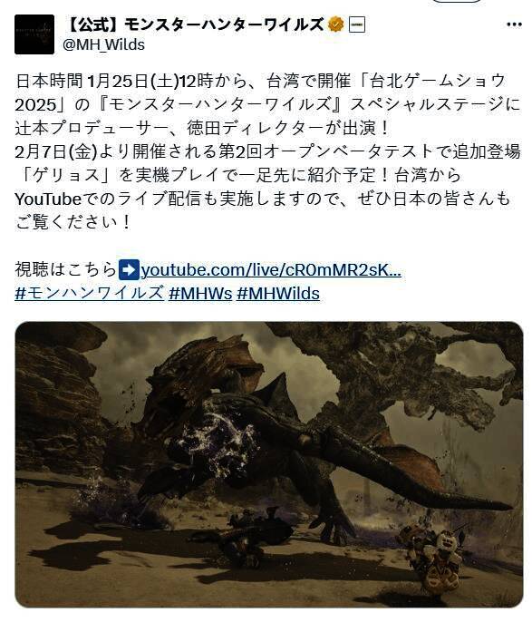 1月23日,卡普空宣布将在台北电玩展2025上举行特别舞台节目,《怪物猎人:荒野》制作人辻本良三和游戏总监德田优也出席活动,届时会提前公布回归怪物“毒怪鸟”的实机演示,该怪物将在即将开启的《怪物猎人:荒野》第二次公开测试中登场。