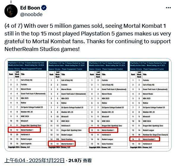 根据《真人快打1》联合创作者兼游戏总监Ed Boon透露,《真人快打1》游戏销量现已超过500万份,该作最初于2023年9月推出,上一次更新销量信息是在2024年8月,当时的数据为400万份,也就是说不到半年的时间该作又售出了100万份。