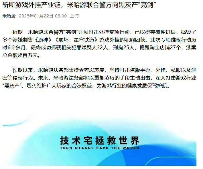 近日米哈游发布公告称,近期联合警方“亮剑”开展打击外挂专项行动,已取得突破性进展,捣毁了多个涉嫌制售《原神》《崩坏:星穹铁道》游戏外挂的犯罪团伙。