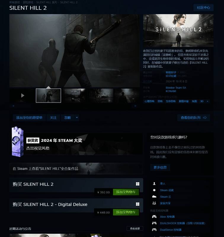 ·《寂静岭2:重制版》¥392,豪华版¥448,支持简中