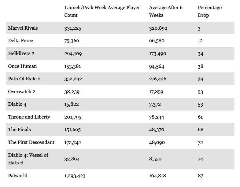 此外同样以6周为区间,《绝地潜兵2》(流失34%)、《流放之路2》(流失39%)和《幻兽帕鲁》(流失87%)这些热门游戏的留存率完全无法和《漫威争锋》进行比较。另外在《漫威争锋》发售前一天推出的《三角洲行动》,玩家流失率为12%(首发75366人,6周后66580人),虽然不及《漫威争锋》坚挺,但也是远超其他游戏作品。
