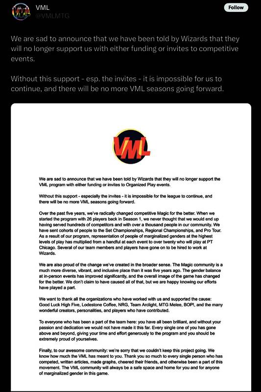 就在川普公布这一行政令之际,威世智停止赞助和支持VML。VML是为《万智牌》边缘性别人群提供赛事的组织,曾在《万智牌》中大力推行多元化。