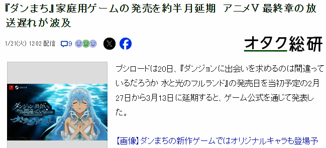 经典动漫《《在地下城寻求邂逅是否搞错了什么?》的家用游戏官方宣布延期,由原定2月27日延期至3月13日,登陆Switch™、Steam平台,理由是动画延期影响。