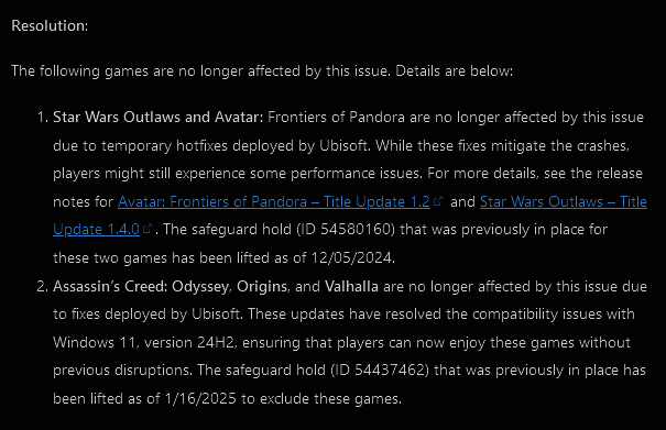 “由于育碧部署了修复程序,《刺客信条:奥德赛》、《起源》和《英灵殿》不再受此问题的影响。这些更新解决了与Windows 11 版本 24H2 的兼容性问题,确保玩家现在可以享受这些游戏而不会出现之前的中断。”
