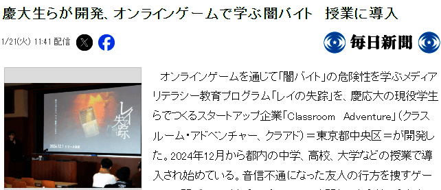 ·Classroom Adventure是由庆应大学的在学大学生3人共同创立的新公司,开发了一款名为《REI的部落格》的网络游戏,通过解谜游戏来揭发各种网络虚假信息,斩获2024年12月由东京都政府举办的初创内容最优秀大奖。