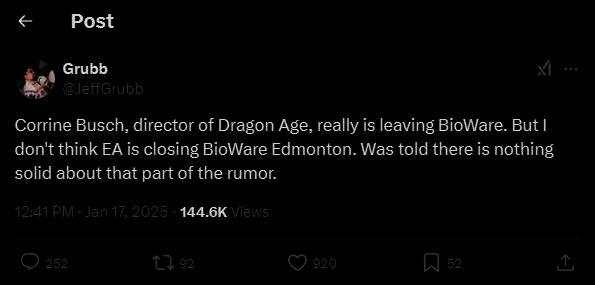 随着《龙腾世纪:影幛守护者》的变性制作人Corinne Busche从BioWare“跑路”,EA将关闭BioWare埃德蒙顿工作室的传闻就甚嚣尘上。