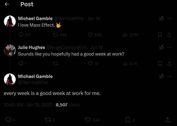 随后有粉丝提问“听起来您希望度过愉快的工作一周”?而Michael Gamble也隐晦地回应说:“对我来说每一个工作周都是良好的。”言下之意《质量效应》新作正在顺利开发中。