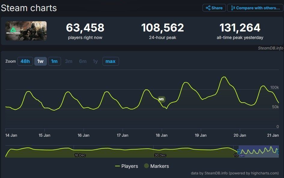 《三角洲行动》S2赛季的表现相当不错。现在据SteamDB数据显示,《三角洲行动》Steam同时在线峰值创下新纪录,达到131264名玩家。