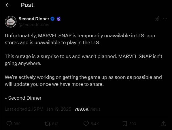 而随着Tik Tok的关闭,由Second Dinner开发、字节跳动旗下Nuverse发行的卡牌对战游戏《漫威Snap》也受到影响,游戏遭到了下架和停止服务。