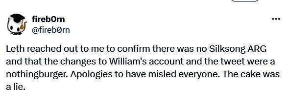 根据《空洞骑士》YouTuber fireb0rn的消息称,《空洞骑士:丝绸之歌》开发商Team Cherry的营销发行主管Matthew Griffin与他进行了联系,澄清了粉丝们对游戏发布的推测,William账户和推文的更改和更新都是无稽之谈,并对误导了玩家表达了歉意。