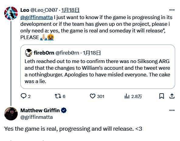 随后,Matthew Griffin还在社交媒体上向玩家们保证:《空洞骑士:丝绸之歌》游戏是真实的,目前仍在开发中,玩家们终有一天会玩到它。