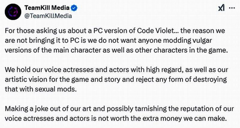 近日TeamKill Media还发推文回应了PC版问题。官方表示《代号:紫罗兰》不会登陆PC,因为他们不希望任何人对游戏女主和其他角色进行“低俗修改”。