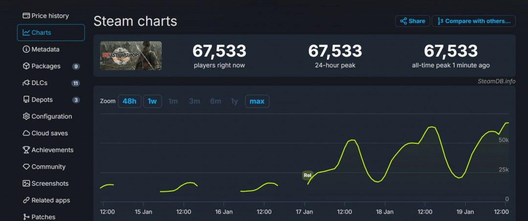 《真三国无双:起源》在Steam上的表现有点慢热,正式发售2天后,Steam在线峰值才有些起色。最高同时在线玩家数量从昨天的5.2万人升至6.7万人,这已经是该系列有史以来Steam在线峰值最高的一作,同时也是光荣旗下Steam在线第二高的游戏,仅次于《卧龙:苍天陨落》。