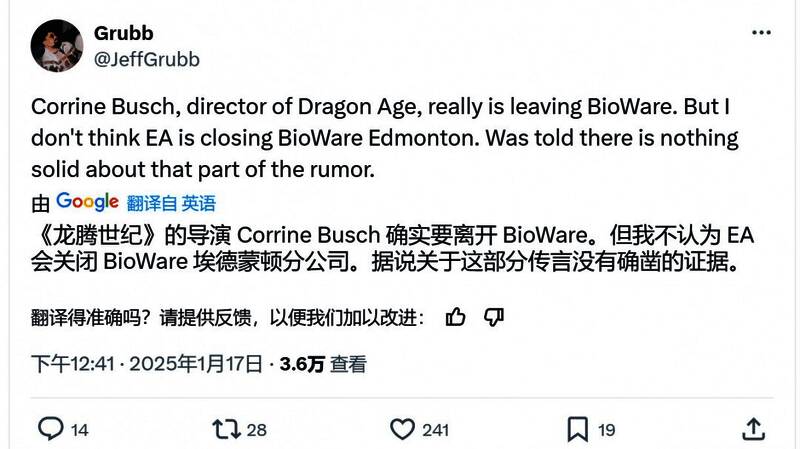 虽然这一消息尚未正式公布,但知名舅舅Jeff Grubb也证实了这一消息。不过Grubb认为EA并不会关停BioWare埃德蒙顿工作室。据Eurogamer,游戏在市场上的表现并未影响她的离职。