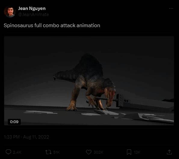 来自《对马岛之魂》团队的动画师Jean Nguyen,曾在2022年公布了一段由他制作的恐龙耍剑的3D动画,并引起了部分玩家的注意,当时就有玩家追问这是什么游戏。