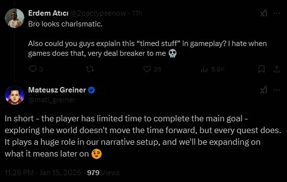 此外Rebel Wolves高级公关经理Mateusz Greiner还补充说:“简而言之,玩家只有有限的时间来完成主要目标——探索世界不会让时间向前推进,但每个任务都会。它在我们的叙事设置中扮演着重要的角色,我们稍后会详细阐述它的含义。”