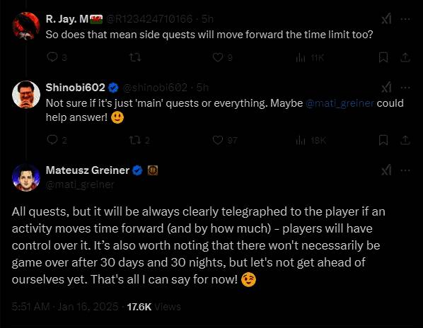 这或许能减少部分玩家对于没法在限时时间完成任务的担忧,Greiner对此再次强调:“所有任务,但如果某项活动将时间向前推进(以及推进多少),玩家将始终清楚地知道这一点——玩家将可以控制它。还有值得注意的是,30天30夜(游戏的限时系统)后游戏不一定就结束了,但我们不要操之过急。我现在只能说这么多!”