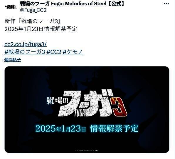 1月16日,CyberConnect2的战略角色扮演游戏《战场的赋格曲3》正式官宣,更多情报预计将在1月23日公布。