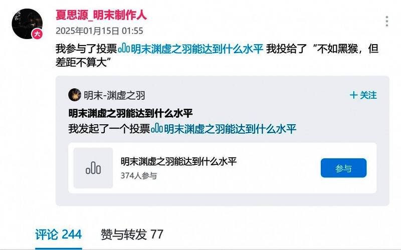 昨天,国产动作RPG游戏《明末:渊虚之羽》制作人夏思源发表了动态,显示他参与了“《明末:渊虚之羽》能达到什么水平?”的投票,他投给了“不如黑猴,但差距不算大”。
