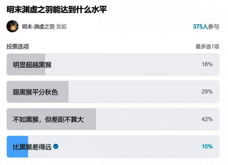 截止到目前,绝大部分玩家投给了“不如黑猴,但差距不算大”,只有10%的玩家投给了“比黑猴差得远”。