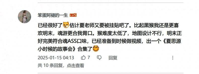 “比起黑猴我还是更喜欢明末,魂游更合我胃口。猴难度太低了,地图设计不行,明末正好完美符合魂ASS口味。”