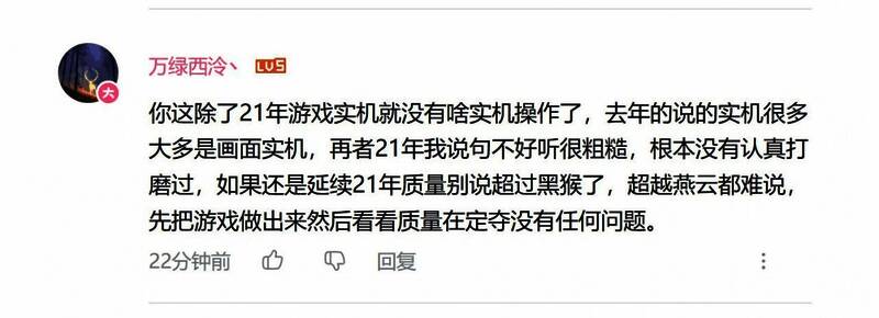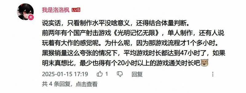 也有玩家喊话,既然想把黑猴作为参照对象,考虑到《黑神话》平均游戏时长达到了47个小时,那么你这款游戏怎么也得有超过20小时的通关时长吧。