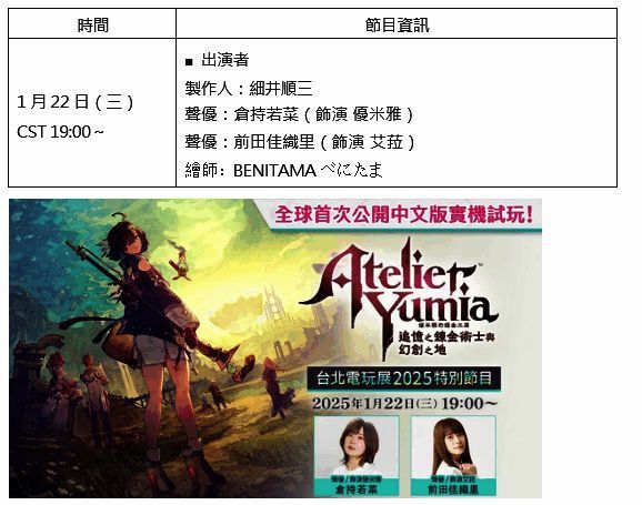 台湾光荣特库摩宣布,2025年1月23日(四)~1月26日(日)为期四天于台北南港展览馆 1 馆(台北市南港区)举行的「2025 台北国际电玩展」(以下简称: TpGS2025),摊位编号为 M731,本日公开『优米雅的炼金工房 ~追忆之炼金术士与幻创之地~』及『Venus Vacation PRISM –DEAD OR ALIVE Xtreme』2025 台北国际电玩展特别节目,并公开现场摊位展出活动内容,以及参加活动好礼。